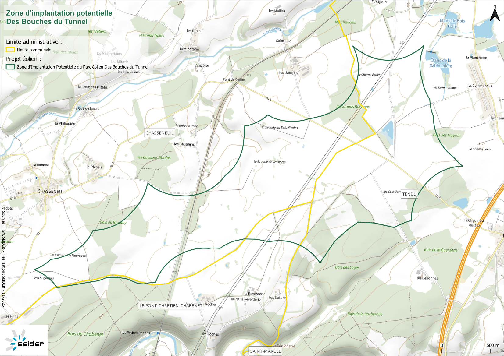 La zone favorable à l’étude du projet éolien Des Bouches du Tunnel a été identifiée sur le secteur des communes suivantes : sur les communes de Chasseneuil et Tendu dans le département de l’Indre en région Centre-Val de Loire.